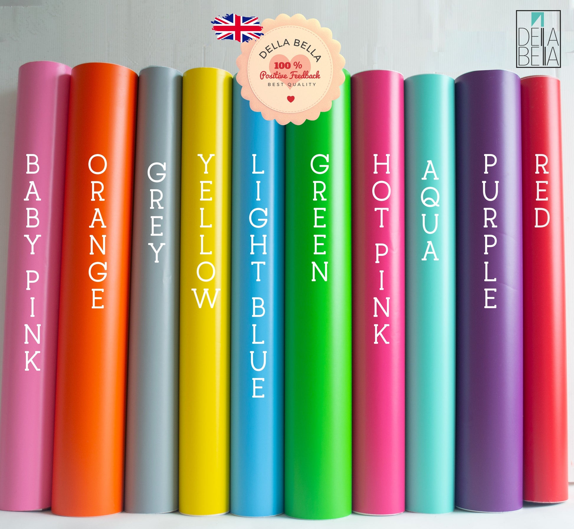 Yellow, Green, Blue, Aqua, Hot Pink, Baby Pink, Purple, Red, Orange, Navy Blue and Grey